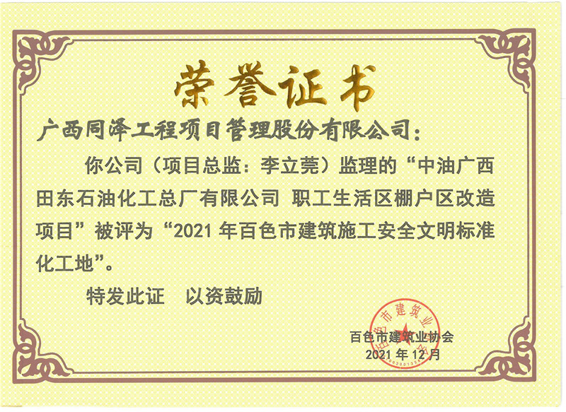 中油广西田东石油化工总厂有限公司职工生活区棚户区改造项目荣获2021年度安全文明标准化工地