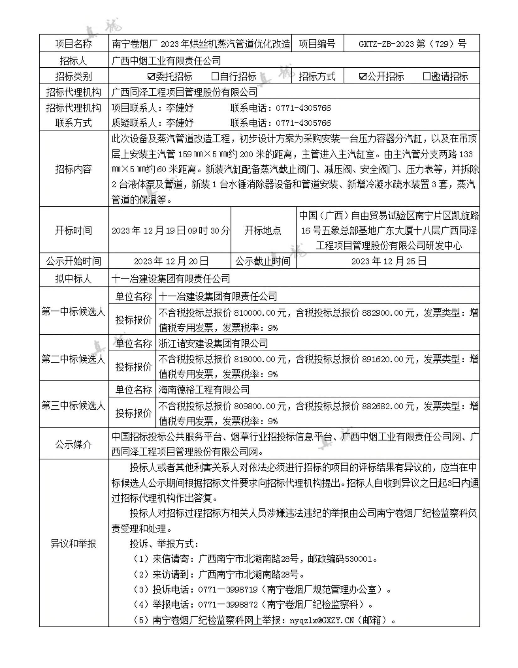 广西中烟工业有限责任公司南宁卷烟厂2023年烘丝机蒸汽管道优化改造(项目编号:GXTZ-ZB-2023第(729)号)中标候选人公示