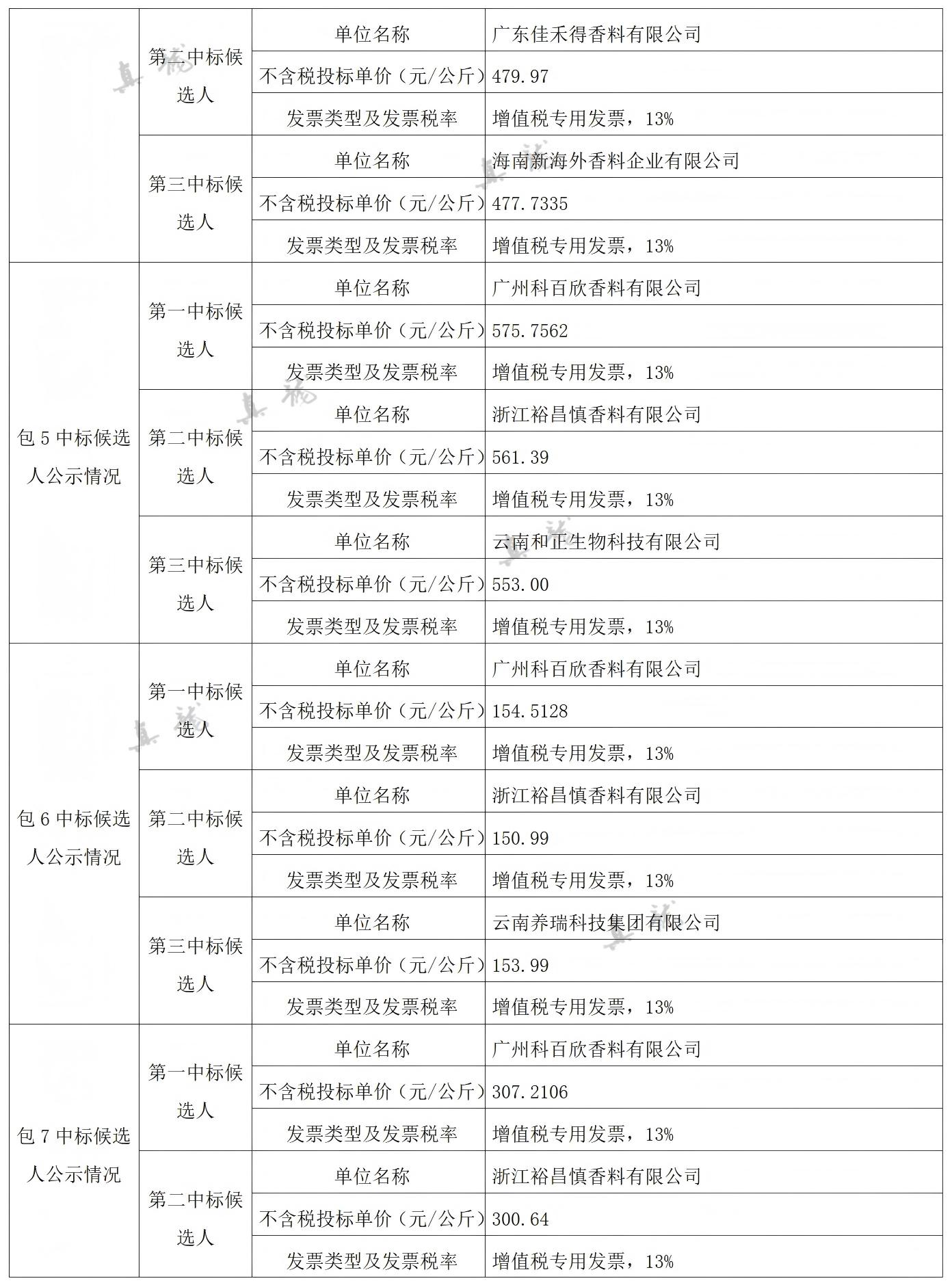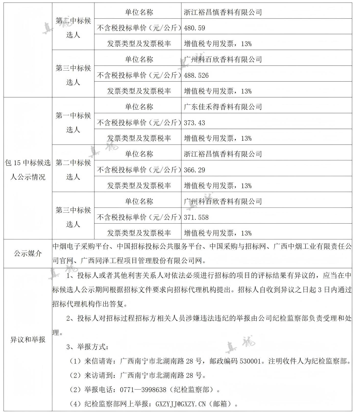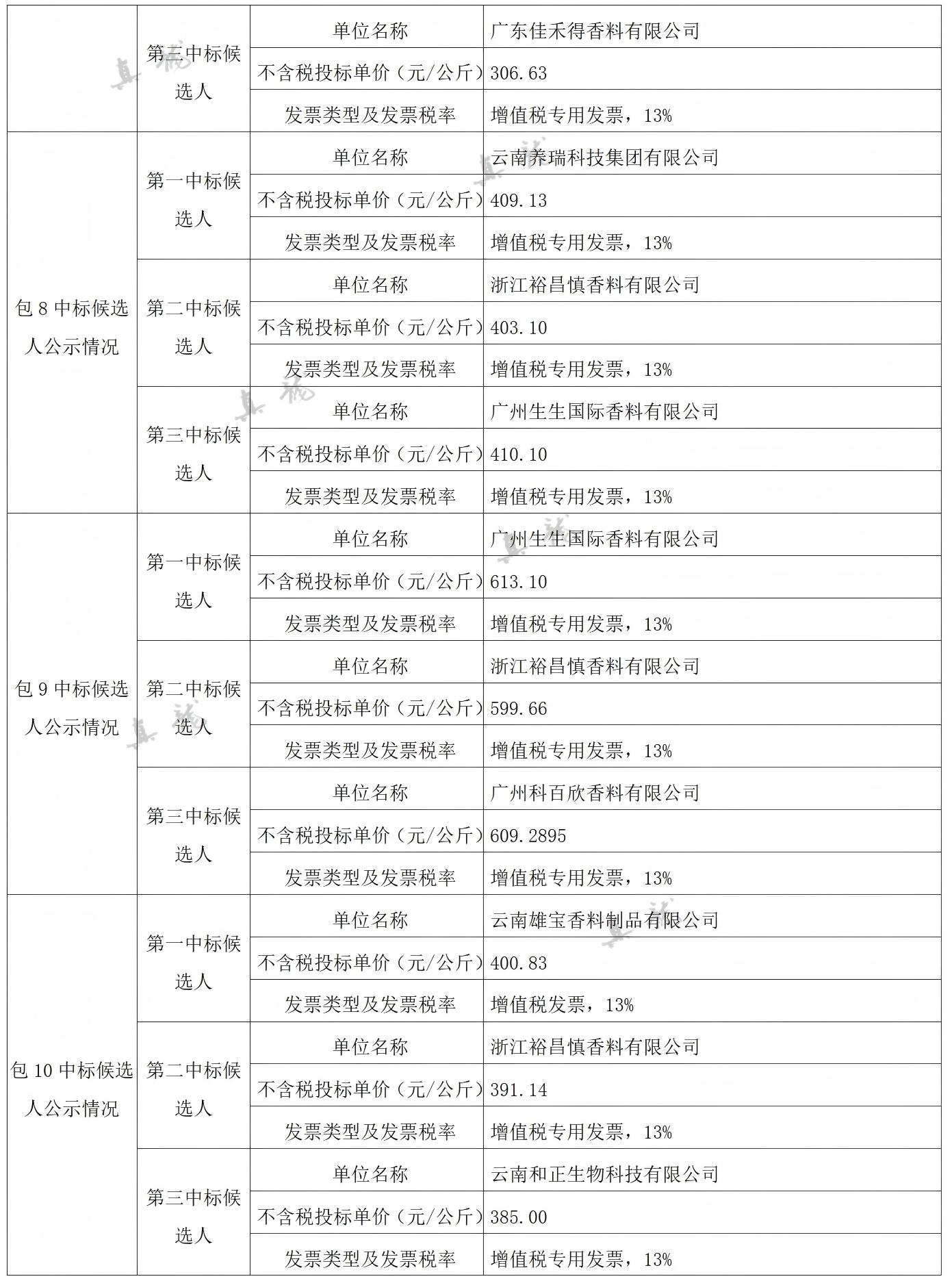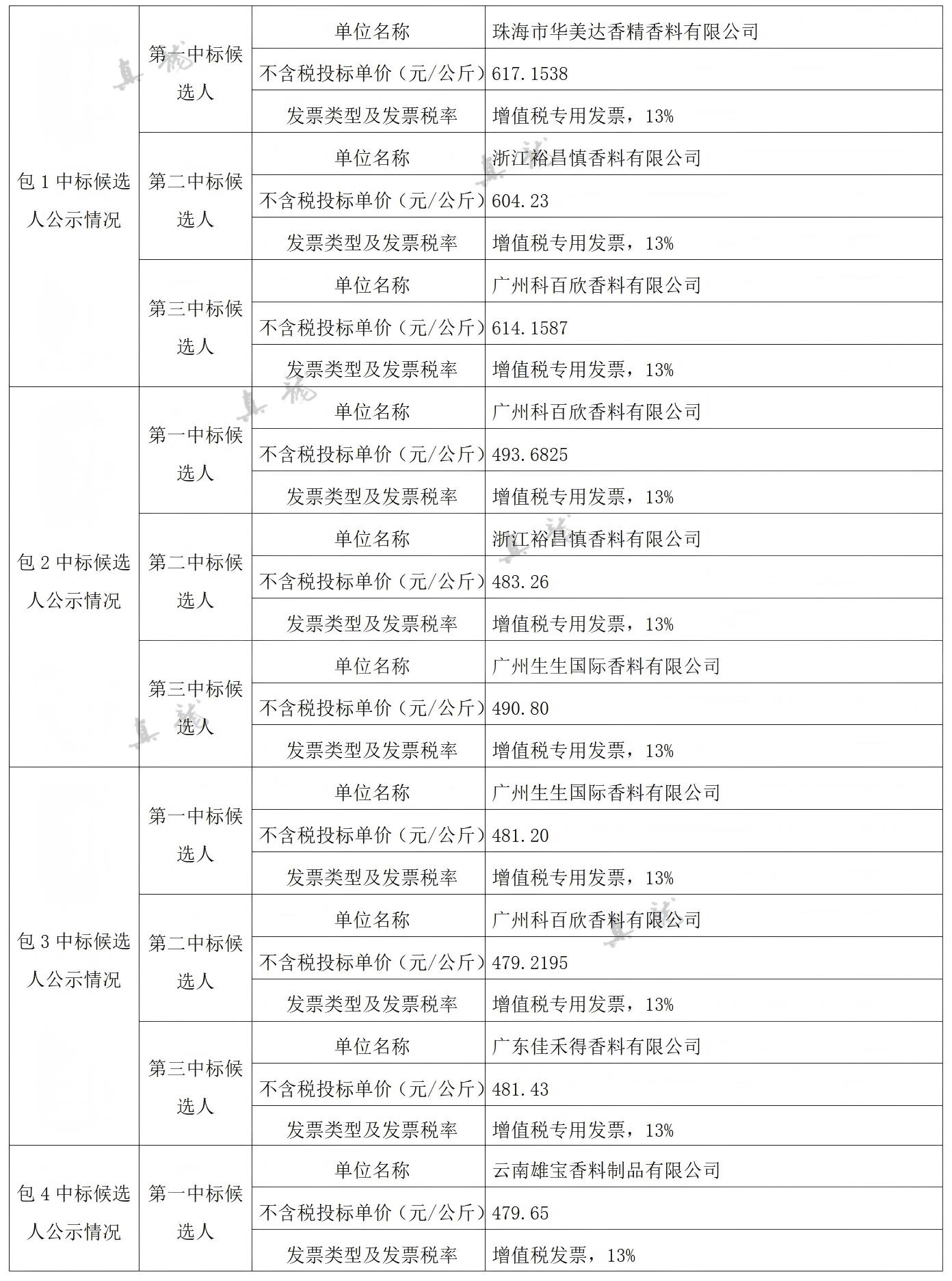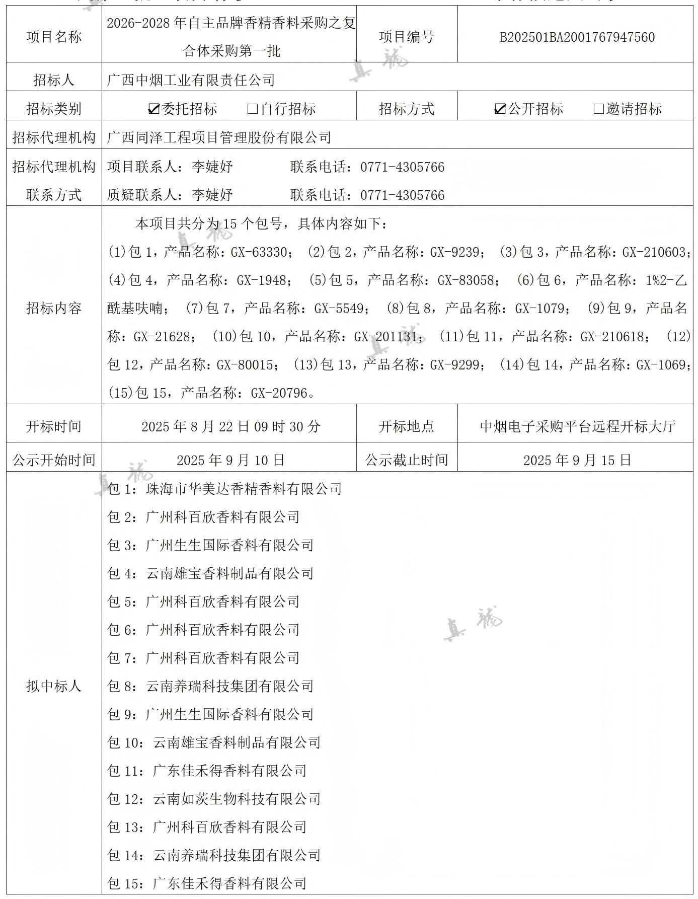 广西中烟工业有限责任公司2026-2028年自主品牌香精香料采购之复合体采购第一批(项目编号:B202501BA2001767947560)中标候选人公示