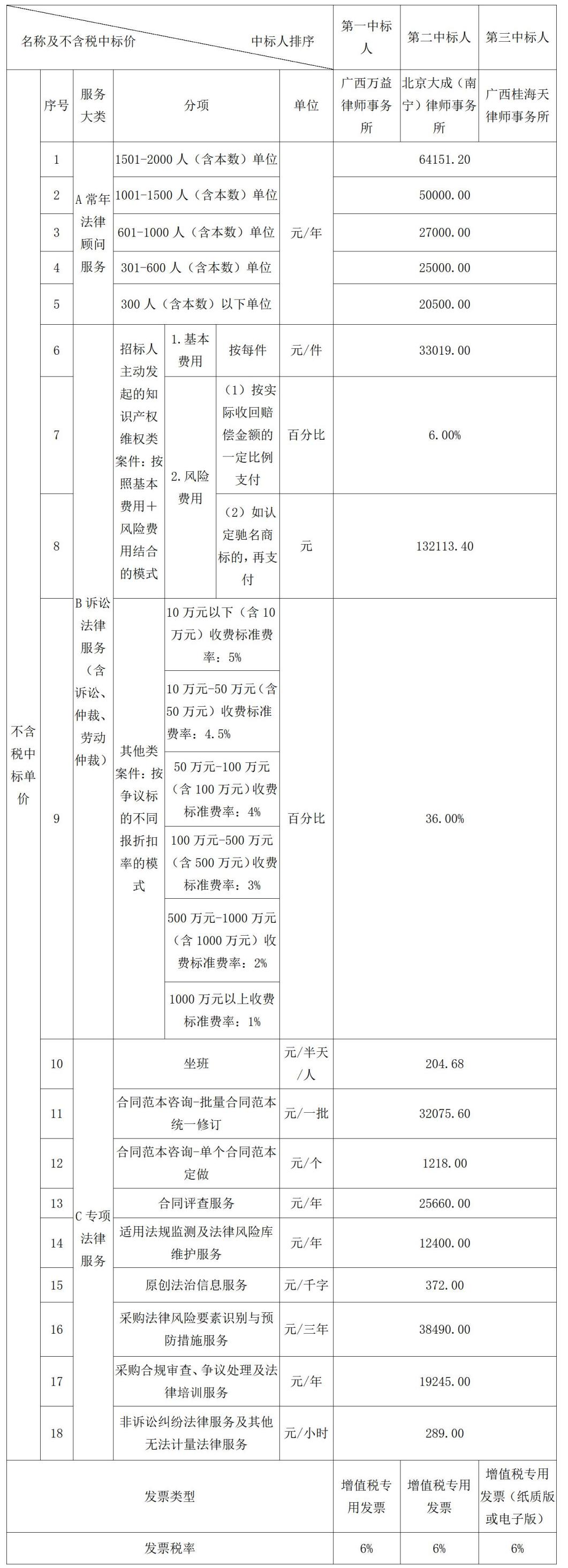 五、招标结果信息: